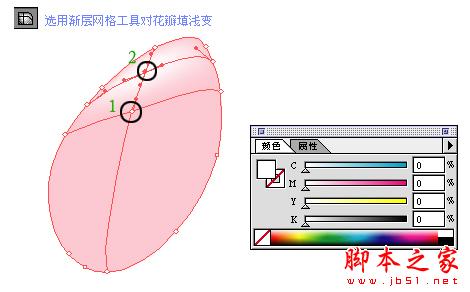 2.用渐层网格工具在我图中标的1和2的位置分别点一下,在2的位置被选中的状态下,从色彩面版上改变该位置的填充为白色。