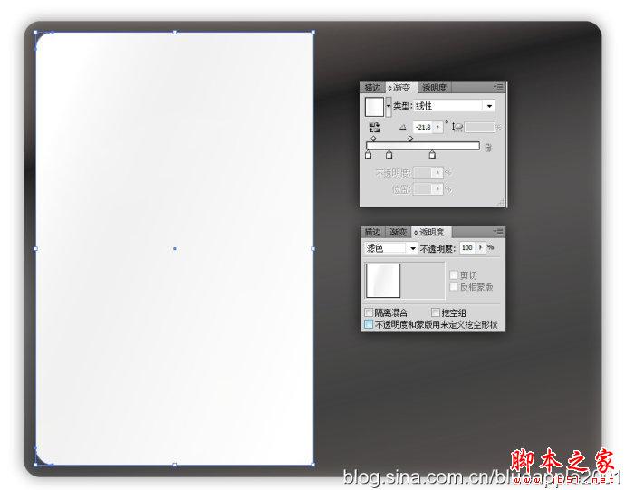 再使用圆角矩形绘制图形,再使用删除锚点工具和转换锚点工具将图形右边的角变直角。为该图形填充白灰渐变(中间的灰为R240 G240 B240),角度设为-21.85°,图层混合模式设为滤色。