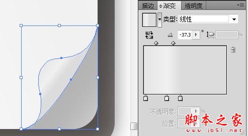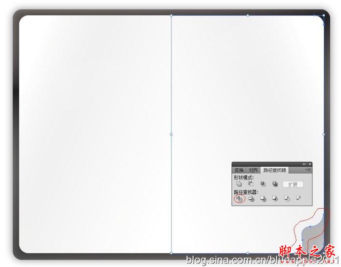 对右下角绘制卷页效果。使用钢笔工具绘制一个类似"W"的路径,选择右页面和"W"路径,Ctrl+Shift+F9调出路径查找器面板,选择分割,并对分割出来的那部分填充灰色渐变(R180 G180 B180)到(R200 G200 B200),角度为-35.1°。