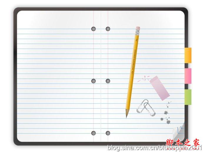 绘制小纸张(可填充细微变化的灰白渐变)和复制一个回形针。可以根据喜好对最上面那张纸使用变形工具进行一定程度的涂抹。同样地,也对这些纸张使用投影。
