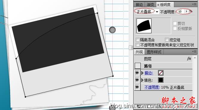 最后绘制照片。一个白色大矩形和一个深灰小矩形,在用钢笔工具绘制一个如下图的形状,使该形状填充黑色,不透明度为10%,图层混合模式为正片叠底。