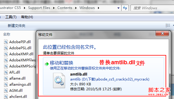 11、找到Adobe Illustrator CS5程序安装文件夹中的amtlib.dll文件,这个文件一般在安装盘符中的X(X代表你的程序安装盘符):\Program Files\Adobe Illustrator CS5\Adobe Illustrator CS5\Support Files\Contents\Windows中,用通用破解补丁将这个文件替换掉。