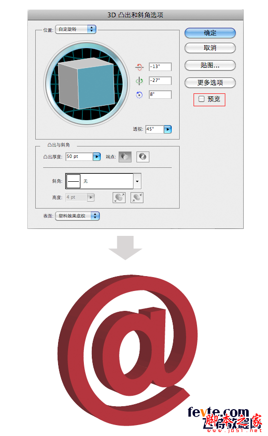 2.选择:效果-3D-凸出和斜角,把预览勾选后调整正方体可以预览图形将要变成什么样子的(我相信这样的透视应该比我们自己抓透视要准一些吧),调整到自己想要的角度,确定好后我们要使各个图层可以编辑(对象-扩展外观),再取消编组这样我们可以直接选取每一个面来进行操作(一般我会根据图形的特点来调整透视的数值)