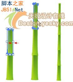 选择在上一步中绘制的竹子主体,按住Alt键的同时向上拖放,复制出一节同样的竹子,当然也可以用通常的复制粘贴的方法。然后“选择工具”将复制到的竹子沿水平方向缩小一下,如图2中最左图所示。确认选中的是复制得到的竹子,选择菜单命令“对象>排列>后移一层”(或按快捷键Ctrl+[),将其排列顺序改为在第一节竹子下方。