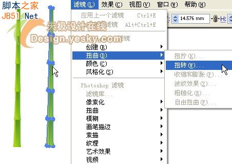 绘制完第一根竹子之后,将其全部选中,然后按住Alt键向右边拖放(或者使用复制粘贴的方法),得到另一个副本。选择新的竹子主干,然后选择菜单命令“滤镜>扭曲>扭转”,如图3所示。当弹出“扭转”对话框后将角度设置为3并单击“确定”按钮,这样复制得到的竹子看上去就会与第一根不太一样了。design.yesky.com©天极软件频道设计在线原创©2007758542