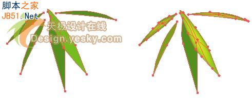 使用“钢笔工具”绘制如图6所示形状的竹叶,并将它们填充为不同的绿色。使用“网格工具”在叶片上添加网格点,并改变网格点的颜色,使竹叶看上去有光照效果,如图6所示。