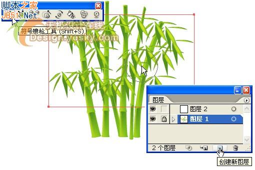 图7 创建竹叶符号在“图层”调板中单击“创建新图层”按钮,创建一个新的图层,并单击图层1眼睛图标右侧以锁定图层1。选择“符号喷枪工具”,在“符号”调板中选择上一步所创建的竹叶符号,在图层2拖动鼠标喷出许多竹叶,如图8所示。