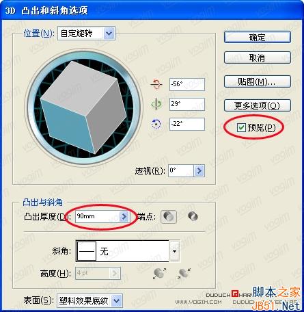 13.将11步制作的图形选中,然后选择“效果”菜单下的“3D”—“凸出和斜角”。钩选“预览”,并设置凸出厚度为90mm。[不要按确定,后面还有设置]