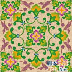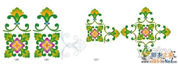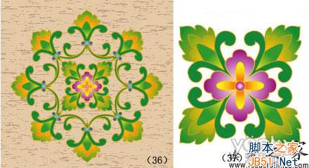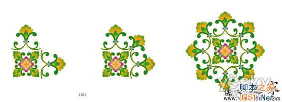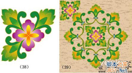 5、将右下角的花形图形选取后删除,形态如图(38)所示,然后将其放置到图案中的左上角位置,如图(39)所示。
