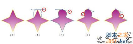 4、单击工具箱中的“转换描点工具”按钮,在星形的控制点上按下鼠标左键拖曳,此时将在控制点的两侧出现控制柄,状态如图(4)