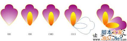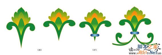 1、按住Alt键,将上面绘制的其中一个辅助图形复制,然后将其拉伸变形,并将花形内部的一个图形进行渐变色修改,其辅助图形调整操作分析如图(26)所示