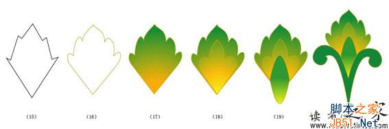 3、用同样方法,选择工具箱中的“钢笔工具”和“转描描点工具”,在图形中绘制如图(18)所示的图形,并由下向上添加黄色(R:247,G:246,B:25)、橘红色(R:247,G:186,B:14)绿色(R:22,G:138,B:54)的放射状渐变色。