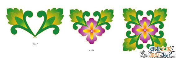 11、将辅助图形与上面完成的花形组合,并通过菜单栏中的“对象”/“排列”/“排到最后面”命令进行位置的调整,图形组合后的形态如图(24)所示