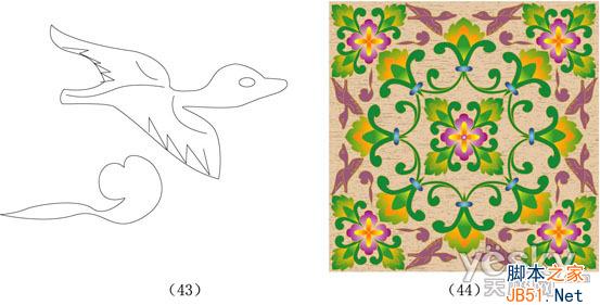 10、将绘制的鸟形图形进行群组后放置到画面中,然后进行复制,完成图案制作,其整体效果如图(44)所示。