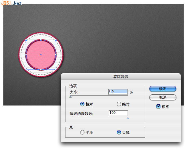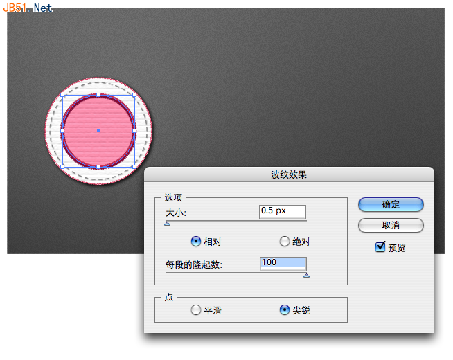 新建0.75pt的高光描边,填充亮红色,对描边应用效果-扭曲和变形-波纹效果。