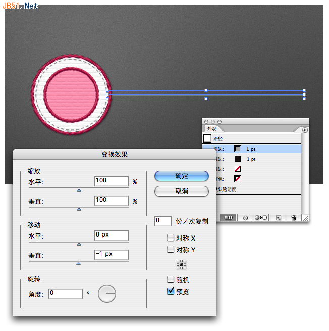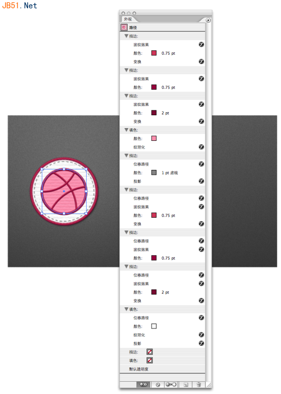 同样方法新建0.75pt中间色和2pt暗部描边,同样应用波纹效果。然后对高光描边应用效果-扭曲和变形-变换效果