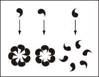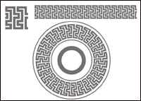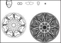 所谓团花图案,就是将图形沿特定轴心作圆周布列。古今中外的团花图案可谓多种多样、异彩纷呈。Illustrator提供的“Pattern brush(图案笔刷)”工具可以迅速准确地进行团花图案的绘制。你只需选定特定的图形,在“Brush(笔刷)”面板选择“ New brush(新笔刷)”,然后选择“Pattern brush(图案笔刷)”就完成了初步设置。现在,你可以绘制一个正圆形,将刚才定义的图案笔刷赋给其轮廓属性即可。