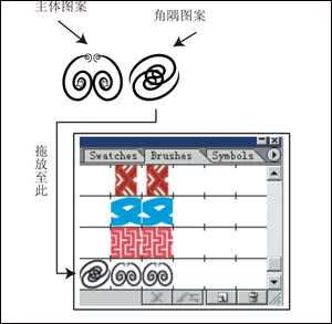 2. 选择角隅图案,同时按下键盘上的“Alt”键,将其拖放至笔刷面板中主体图案的左侧,在紧跟着跳出的对话框中检查一下该图案是否已放置在五个定位方格中的第二个,如果是,则按下“OK”按钮。