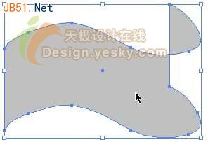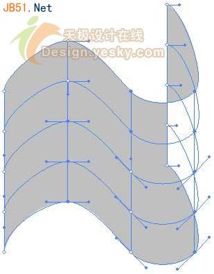现在就有了一个基本的卷曲图形。当然你可以在稍稍调整一下,让对象过渡更加平滑一些。要做到这一点需要选择锚点的手柄,调整到和曲线相切的位置。重复这一调整步骤,直到所有的点都调整完毕。 注意下图的手柄是如何调整的。(可以多调整出一些不同的轮廓形状,然后通过下面的步骤看分别可以得到什么不同的结果。)