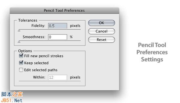 9 设置铅笔工具的参数.双击铅笔图标,Fidelity→0.5 pixels,Smoothness→0%.