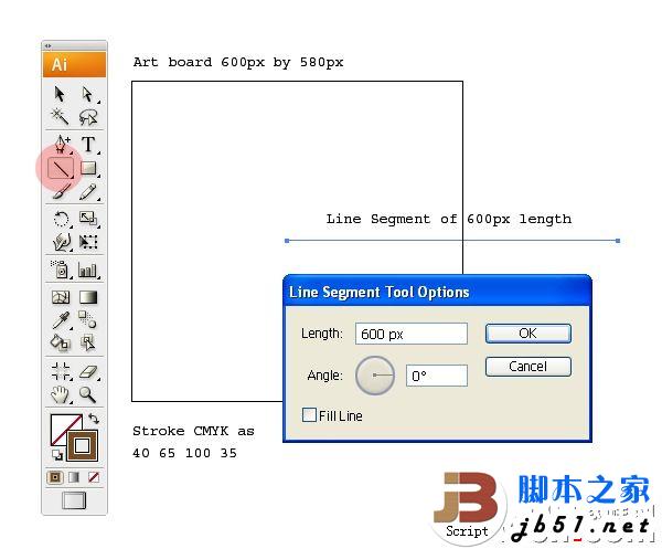 Step 1:新建一个600px – 580px 大小的画板. 下一步, 使用直线段工具 (backslash), 画一条 长600px 颜色设置为 CMYK: C=40, M=65, Y=100, K=35.