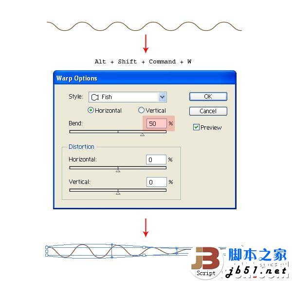 Step 3:涟漪由中心向外移动所产生的波浪逐渐消失,所以我要加一个波浪逐渐消失的变形. 选择 > 封套扭曲 > 用变形建立(快捷键Alt + Shift + Ctrl + W). 在变形选项里的样式选择“鱼”,弯曲设为50%.前后效果如下。