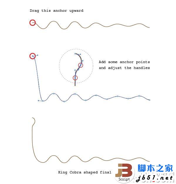 Step 5:接下来, 我们将添加水滴掉下来弹起的效果. 使用直接选择工具 (A), 选中第一个锚点 然后往上拖. 使用添加锚点工具 (+), 在如图所示位置添加两个锚点.使用直接选择工具修改锚点路径形状如下图。然后复制这条曲线放一边作为备份。