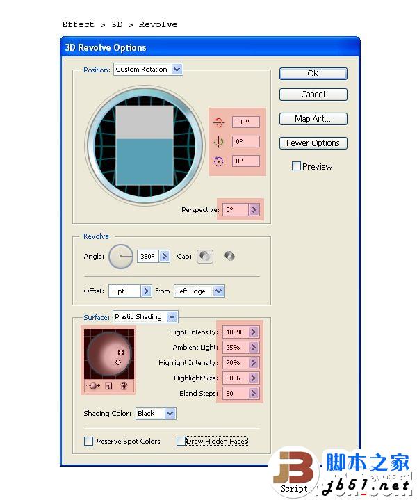 Step 6:现在形状线条已经准备好了, 选中线条然后执行 效果 > 3D > 绕转. 在参数设置对话框的右边点击更多选项,参数设置如下图,表面选项选塑料底纹效果,更多选项里的缩略图下面点击新建,新建一个高光。两个高光位置如下图,其他参数设置如下图。