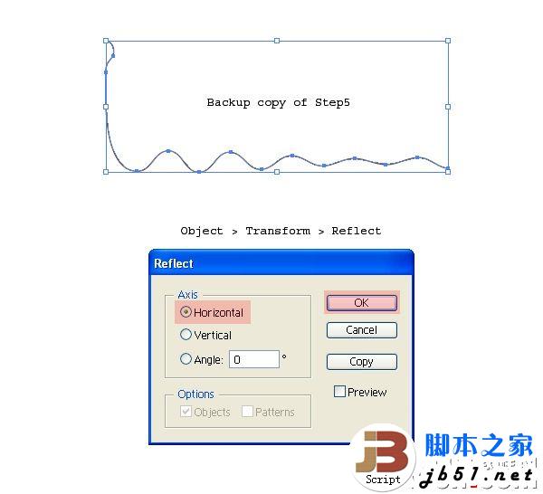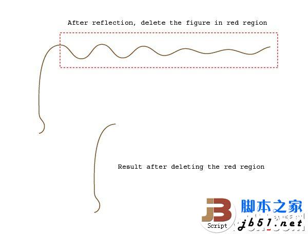 Step 7:现在我再来添加一些光照反射效果,选择我们第五步的时候备份的那一条曲线执行:对象 > 变换> 对称. 水平对称, 使用直接选择工具选择下图红色部分,然后删除。