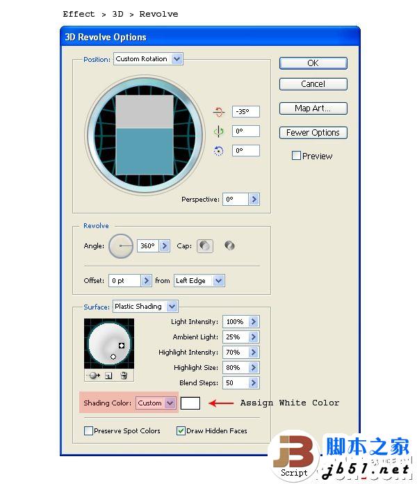 Step 8:选择线条然后执行 效果 > 3D > 绕转.参数设置和上一次一样. 只是把阴影颜色设置为白色。