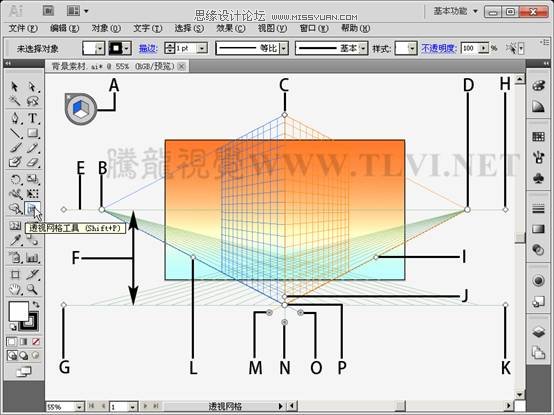 透视网格:A.平面切换构件 B.左侧消失点 C.垂直网格长度 D.右侧消失点 E.水平线 F.水平高度 G.地平线 H.水平线 I.网格长度 J.网格单元格大小 K.地平线 L.网格长度 M.右侧网格平面控制 N.水平网格平面控制 O.左侧网格平面控制 P.原稿。