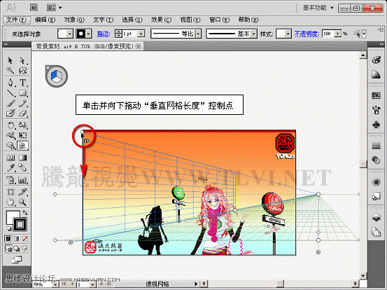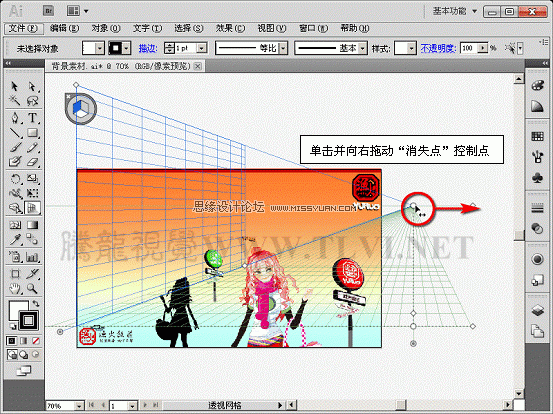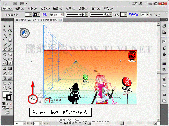 (2)首先将“文字装饰”图层隐藏,单击“透视网格”工具,显示透视网格,熟悉网格各部分的名称。