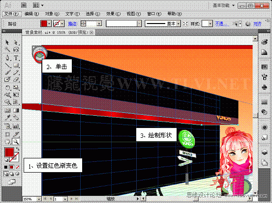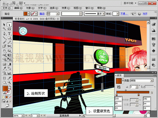 (4)使用“透视网格”工具单击“平面切换构件”的右面,调整路径的透视关系,并对渐变进行调整。