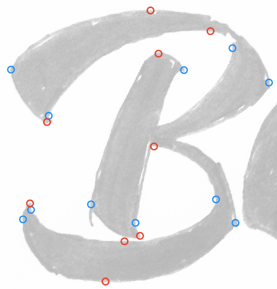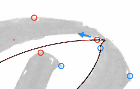 看看下面4图中简化的线框图。红色的圆圈代表水平手柄的节点,蓝色圆圈是垂直手柄的节点。注意观察每条曲线最外侧的节点的位置设定。