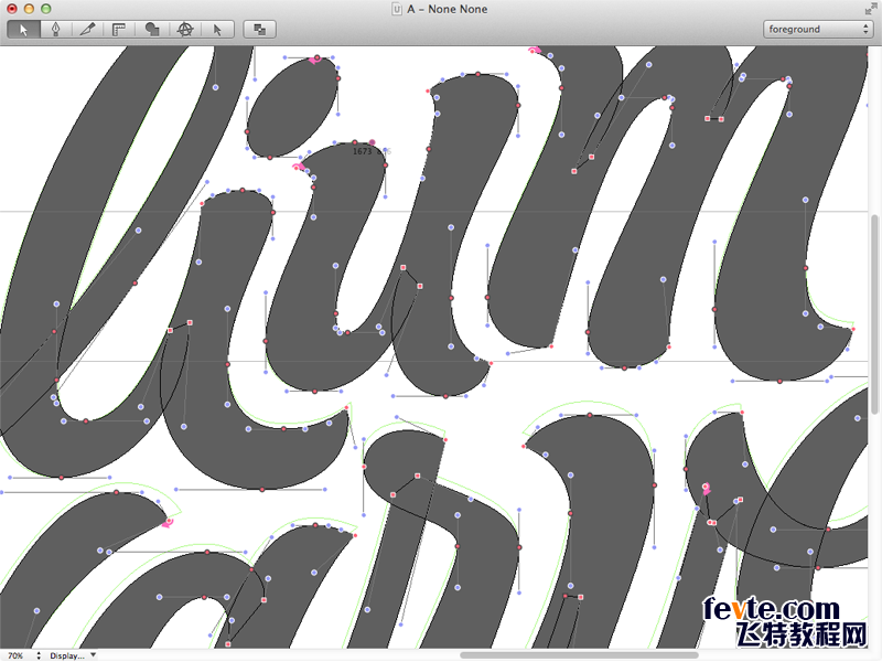 此时此刻,这些垂直和水平的贝塞尔曲线手柄就是能否调出完美曲线的制约因素了。当你调整手柄的时候,手指应该始终按住Shift键,确保调整手柄长度的时候,角度不会偏移。这个时候,你会发现你控制手柄更加自如了。这样一来,我发现自己使用AI制作复杂的字体和图形越来越得心应手了。
