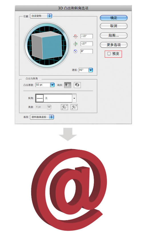 2、选择:效果-3D-凸出和斜角,把预览勾选后调整正方体可以预览图形将要变成什么样子的,调整到自己想要的角度,确定好后我们要使各个图层可以编辑(对象-扩展外观),再取消编组。这样我们可以直接选取每一个面来进行操作(一般我会根据图形的特点来调整透视的数值)。