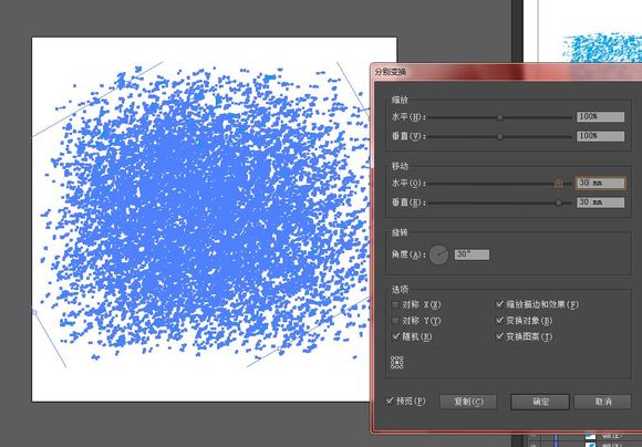 4.选择导航栏的对象-变换-分别变换,填写一个角度,点选随机,移动填一个数值(数值太小好像出不来发散的效果),然后点击复制;