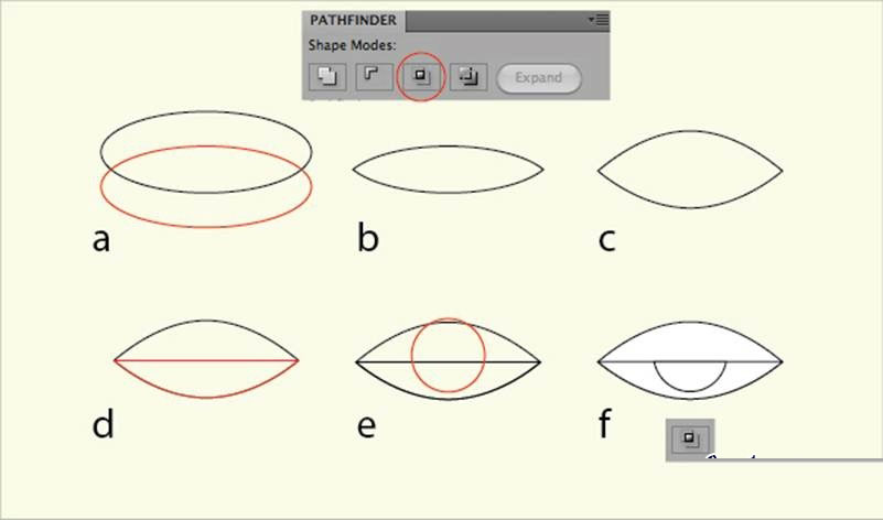 • 选中两个椭圆,选择路径寻找器面板中的交集(b)