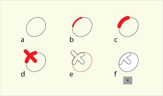 手 掌的绘制也从一个圆角矩形开始(a)。选择直线工具 (\) ,绘制一根斜线 (b) ,用镜像工具(O)复制出另一根手指(c)(选中手指,选择镜像工具,按住Alt键单击手指下端的锚点,弹出窗口,选择垂直,单击复制。译者注),绘制中 间的手指(d),用钢笔工具(P)画一根弯曲的线作为拇指(e)。最后, 扩展手指(f),选中整个手掌,选择路径寻找器面板中的合集。