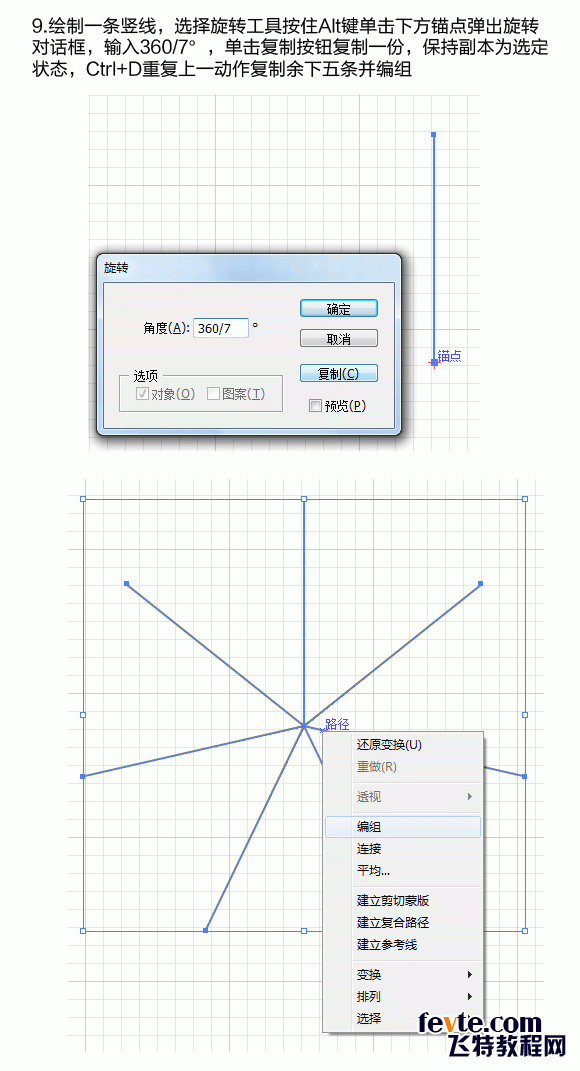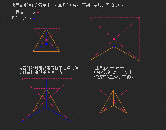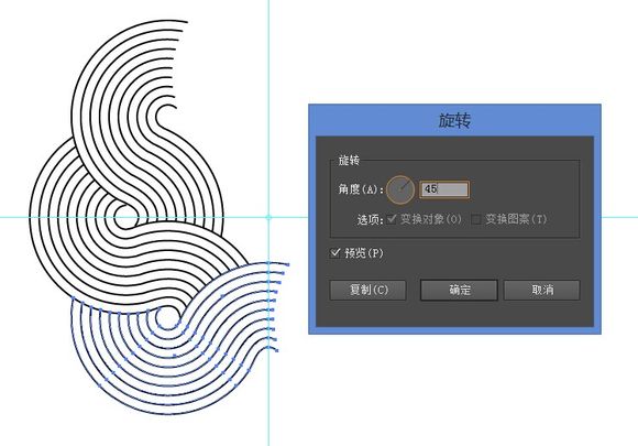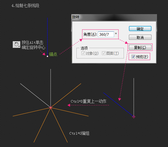 改变旋转中心轴为画的参考矩形旋转45。