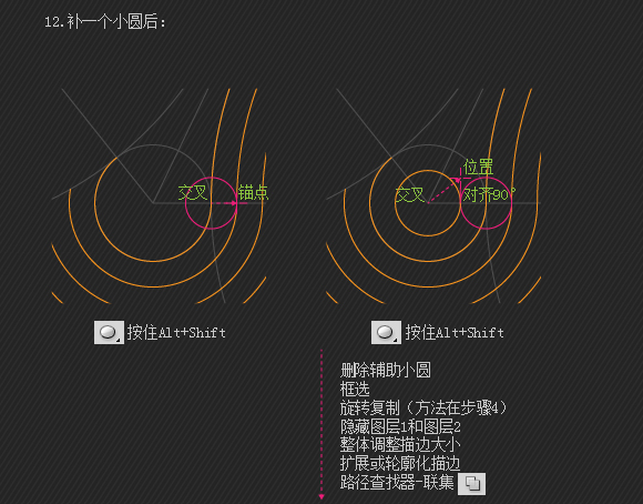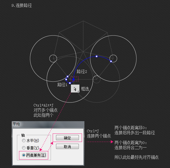 同以上一样。添加小圆适当位置锚点并删除不需要的部分,然后CTRL+J与大圆的留下部分连接成一条路径。