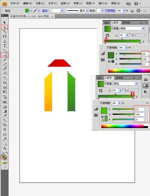 4、在工具箱中分别选择直接选择工具和矩形工具,在工作区中拖出一个矩形形状,接着鼠标点击矩形,调整成无规则图形,在工具箱中选择设置渐变工具,弹出渐变编辑器,在渐变编辑器设置RGB值:在A处设置RGB值分别为50、120、37,在B处设置RGB值分别为72、198、0,如图4所示。