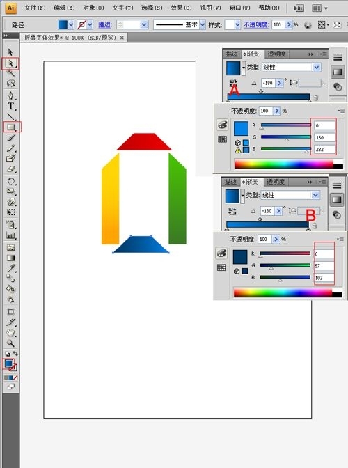 5、在工具箱中分别选择直接选择工具和矩形工具,在工作区中拖出一个矩形形状,接着鼠标点击矩形,调整成无规则图形,在工具箱中选择设置渐变工具,弹出渐变编辑器,在渐变编辑器设置RGB值:在A处设置RGB值分别为0、130、232,在B处设置RGB值分别为0、57、102,如图5所示。