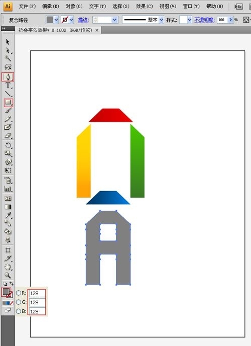6、选择工具箱中的钢笔工具,在工作区中绘制字母"A"的形状,封闭路径,然后设置颜色,设置RGB值为:128、128、128,如图6所示。