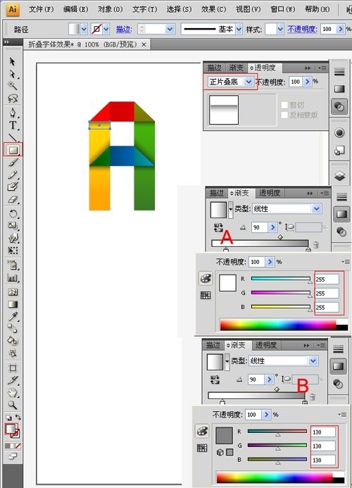 11、在工具箱中选择矩形工具,在工作区拖出一个矩形形状,并工具箱中选择设置渐变工具,弹出渐变编辑器,在渐变编辑器设置RGB值:在A处设置RGB值分别为255、255、255,在B处设置RGB值分别为130、130、130,并选择透明度,设置为:正片叠加,如图11所示。