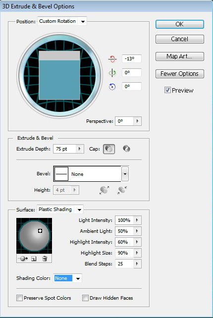 在Illustrator中,选择文本和选择3D效果,挤出和斜角。继续选择如下所示的设置。在这个阶段发挥不同的3D设置,看你喜欢什么样的结果,它是一个好主意,但现在,以下是一个很好的选择。
