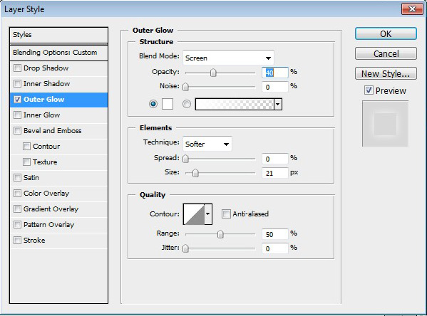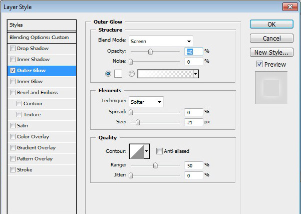 添加另一个图层,选择文本,并添加以下设置外发光,记得减少补"0".
