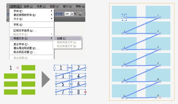 【05】使用魔棒工具选择所有矩形,然后使用"串接文本"功能连接各页页码(如图↓)
