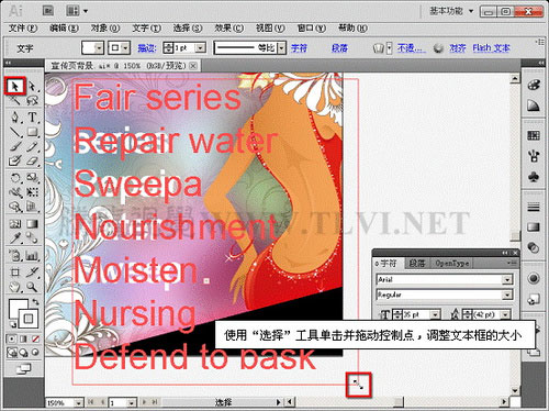 (11)使用"选择"工具,调整文本块的大小,显示溢出的文字。