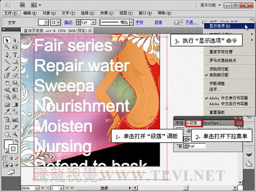 当处理包括多段落的长文本时,可在"段落"调板中进行文本对齐、段落缩进、段落间距以及制表符等设置。
